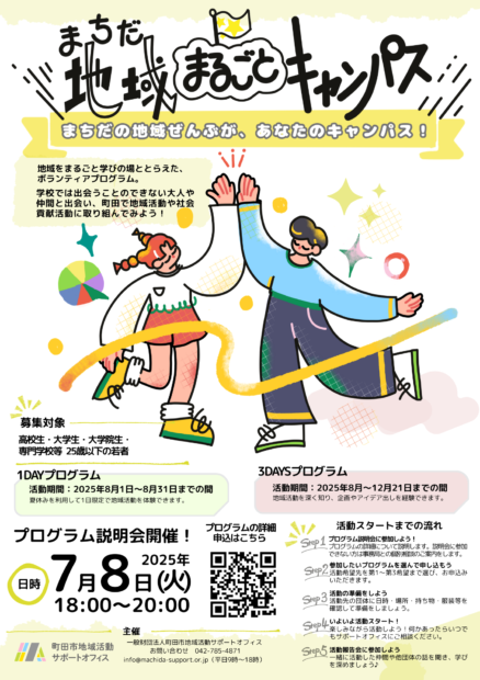町田市地域活動サポートオフィスでは、本プログラムを通じて高校生・大学生等が地域のさまざまな人々や活動に出会い、ともに考え一緒に活動することで自己成長することを応援します。