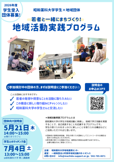 サポートオフィスでは、2023年度から昭和薬科大学地域連携センターとともに学生が町田市の地域団体や企業で地域活動を行う「地域活動実践プログラム」を実施しています。現在、学生を受け入れてくださる団体を募集中です!