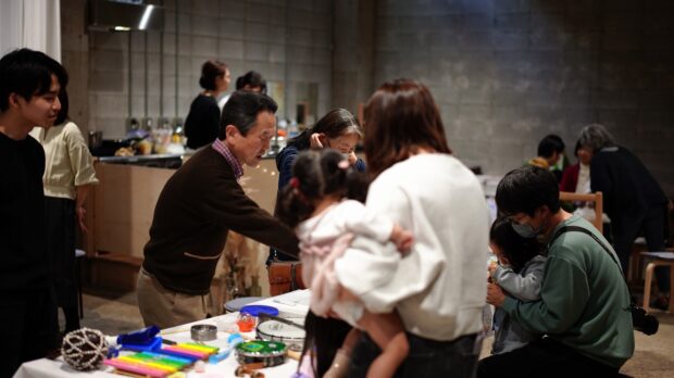 空き箱にビーズやビー玉、スパンコールなどを入れ、オリジナルの楽器づくりをするところからスタート。イベント終盤には会場にいらっしゃる方々が楽器や手拍子などで完全即興音楽に参加しました。お互いが発する音を聴き、それに音で応答する姿はまさに「対話」そのものでした。
