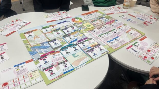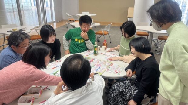 ゲームは、地域住民の悩みを解決するために集まった地域住民のグループ「暮らしの談話室」が舞台。ゲームクリアのためには、参加者同士のコミュニケーションが重要です。それぞれの持っている資源やつながりを活かし、全員で協力して地域の課題解決に取り組みます。体験会は2回実施し、のべ13名が参加しました。参加した皆さんの間ではプレイを進める中でやりとりが盛んに行われていました。