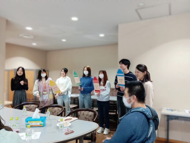 最後は、地域子育て相談センターの方による「お楽しみの時間」。はじめに「どんな色が好き」の歌を学生さんも一緒に参加して、ふりつきでお披露目。その後、絵本の読み聞かせで終了しました。お子さんたちも音楽に合わせてからだを動かし、それを見守る大人にとっても楽しい時間となりました